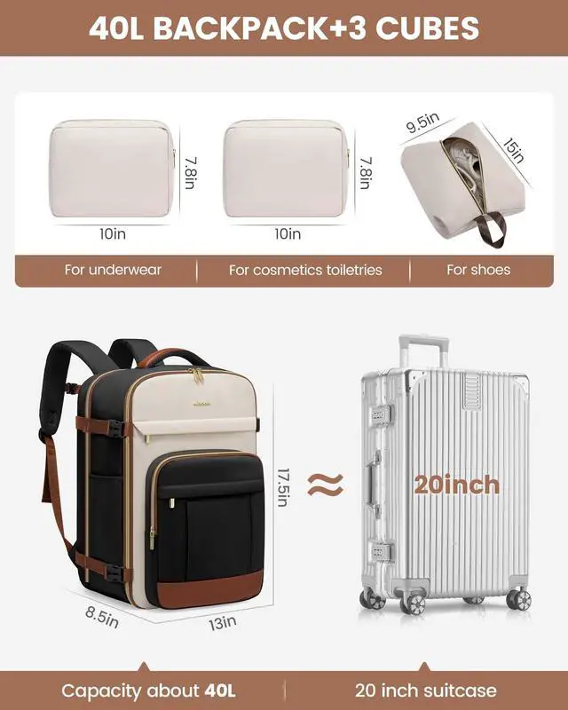 Airline-Approved Carry-On Size: This travel backpack (18x14x8 inches) is perfect for budget airlines like Spirit, Frontier, and Jet Blue, fitting seamlessly under seats and in overhead compartments. Ideal for hassle-free travel ^^ Spacious 40L