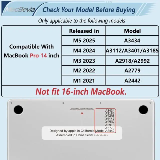 Models: M5 A3434/ M4 A3112 A3401 A3185/ M3 A2918 A2992/ M2 A2779/ M1 A2442. Please check the model number on the bottom of your MacBook Pro to ensure compatibility ^^ Comprehensive Protection, Lightweight