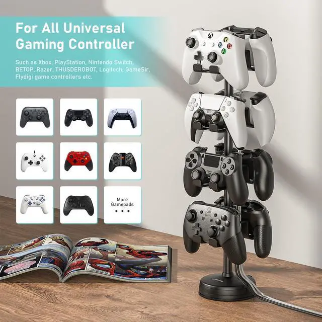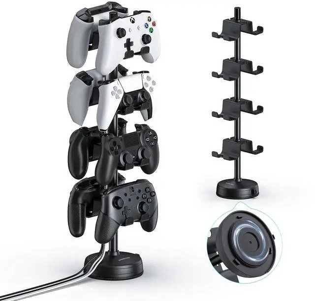 The stand base is designed with a weighted iron, even without the use of the base suction cups, the stand can remain stable, after using the suction cups, even if you touch the stand will not fall, very solid. Perfect for use in the gaming area, office, studio, bedroom or next to the TV. ^^ Stylish Special DesignOur game controller stand is designed with beautiful shape and elegant texture, the stand is in harmony with the game controller, showing a luxurious feeling, finish storing the game controller and also a perfect display stand. The stand design is convenient for the controller to dissipate heat after playing games. Our controller stand can meet your various game management needs.