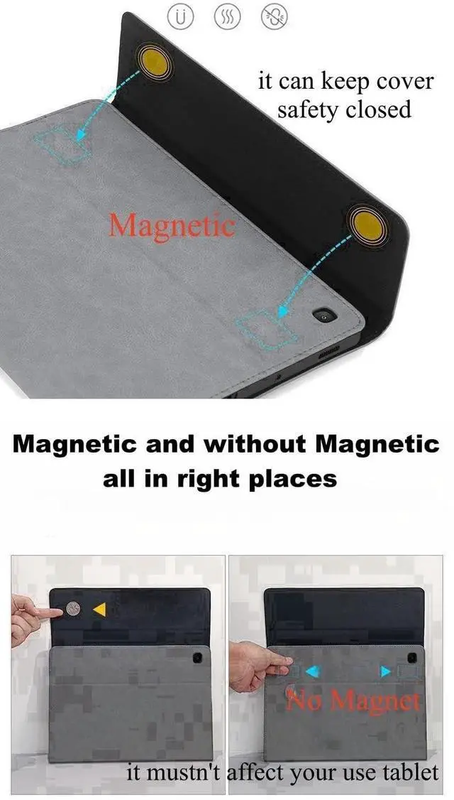 • Magnet Design&Auto Sleep/WakeMagnetic closure keeps front cover sealed.but it mustn't affect you use your S Pen and Tablet. Smart Cover with Precise cutout, device can be charged without removing the case.