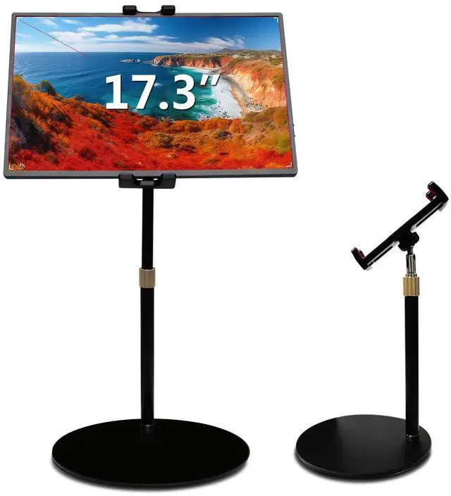 Maximum 9.85 '' Clamp Length--Our universal adjustable iPad stand is compatible with screen devices ranging from 4.7" to 17.3". The adjustable tablet stand compatible with iPad Pro series, iPad series, iPad Air series, iPad Mini series, Samsung Galaxy Tab series, Microsoft Surface Pro series, Echo Show 15, Kindle, and Switch. The adjustable clip can securely hold devices with a maximum width of 9.85 inches ^^ Heavy Duty Base--This portable monitor stand holder for desk features a reinforced tablet clamp, a thickened all-metal support rod, and a heavy duty base which weights 1.76 lb with an anti-slip pad.
