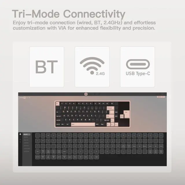 Wireless Connectivity ^^ Latency: 2ms Wired, 3ms 2.4G Wireless, 7ms BT ^^ Five-layer Foam and 14 Dampening Buds ^^ FR4 Plates with Flex Cuts ^^ Pleasing Sound Feedback ^^ Double Shot PBT Keycaps ^^ Laptops, Desktops, and Monitors Compatibility