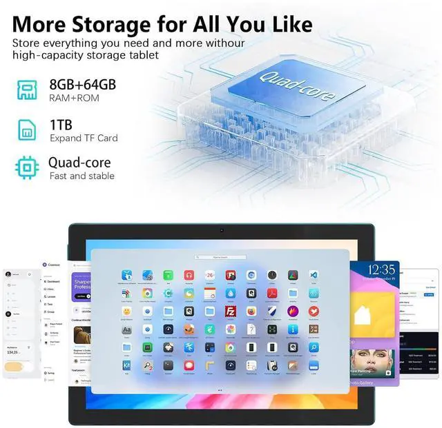 Faster Responsive PerformanceOur 10 inch tablet equipped with stable Android 14.0 system, 5G WIFI-6, support G-sensor, Bluetooth, 8GB RAM(Includes 6GB of virtual memory) and 64GB ROM, with microSD card slot which can expanded up to 1024GB, more app, songs, videos and pictures can be saved right on your tablet.