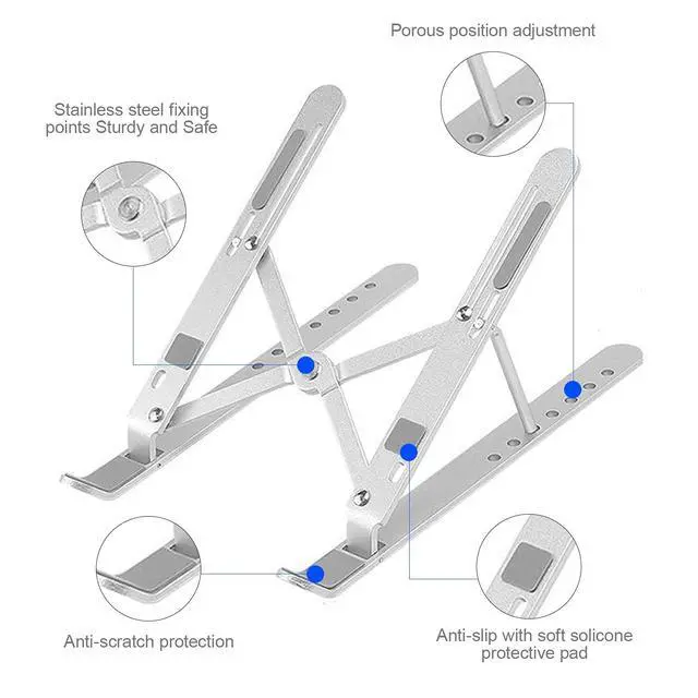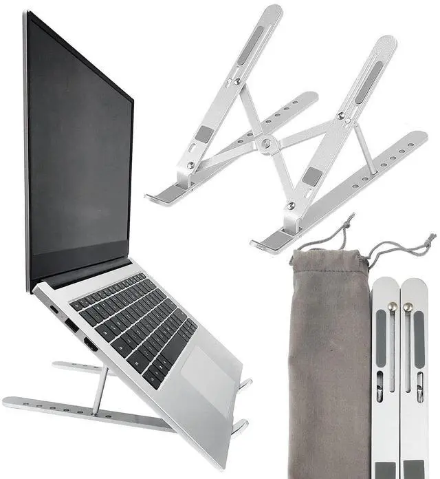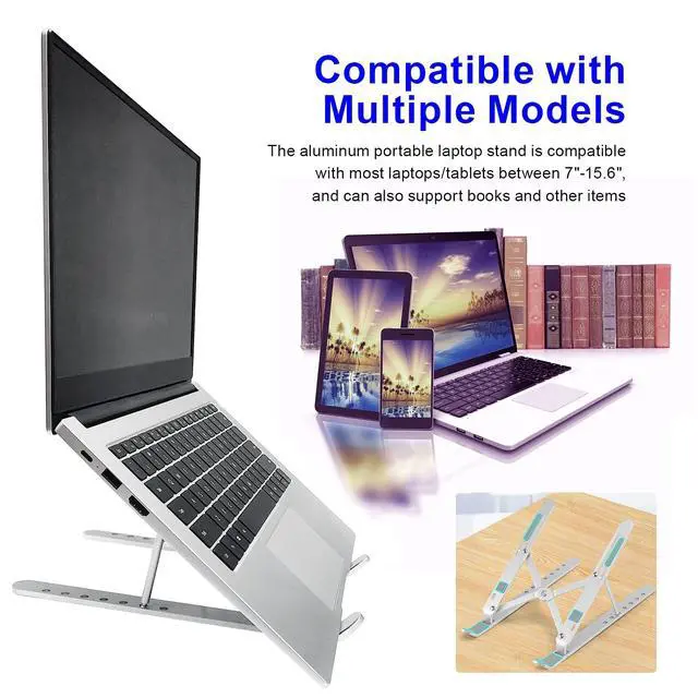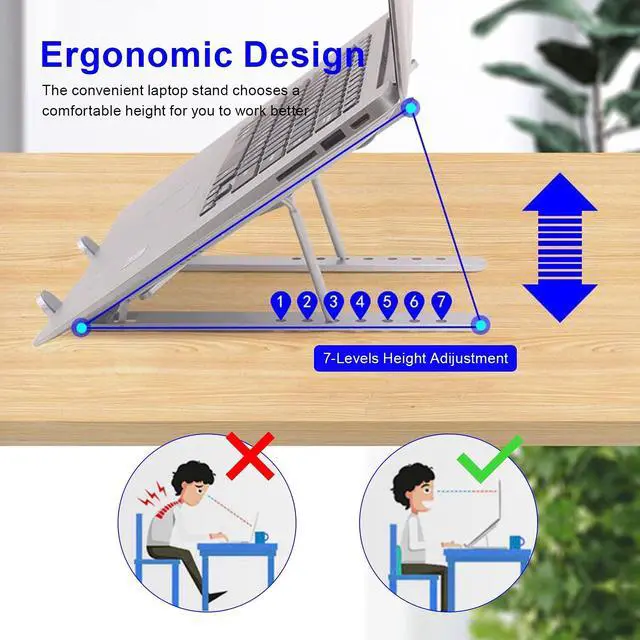 [Multi-angle adjustable design]: The notebook and tablet stand provide 7 levels of height adjustment, which can be adjusted to a comfortable operating angle and height according to actual needs. The ergonomic design makes it easier to view and type in office, and relieve neck, shoulder and spine pain ^^ [Wide compatibility]: This aluminum portable laptop stand fits most laptops from 7 to 15.6 inches. It is also suitable for mobile phones, tablets, kindles, books from 6 inches to 12.9 inches ^^ [Foldable and light]: The laptop stand on the desk does not need to be installed, it can be used when opened, and is equipped with a portable storage bag, which is convenient to carry and fits into a computer bag. The laptop stand can save desktop space, support the keyboard, and design a new workstation at home. The innovative portable design allows you to take it with you and use the stand to add more comfort at home, office, business trip or other places.