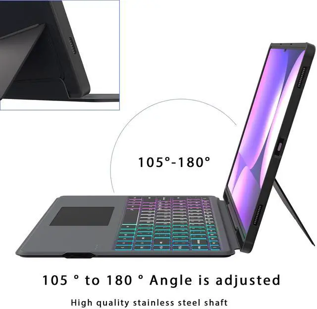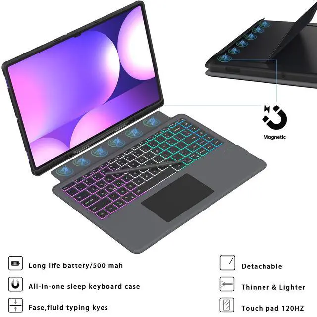 TIPS: The dimension of keyboard case is: 12.99 inches (L) * 9.06 inches (W) * 0.78 inches (H), weight is 2.17 lbs; plus the weight of the tablet is about 3.86 lbs ^^ Backlit Keyboard Tab S9 ultra 2023/S10 ultra 2024 - tab S9 ultra tablet case with keyboard provides 7 color backlit options & 3 brightness modes, It has 3 brightness modes adjustments for more comfort. The spacious layout of the backlit keyboard is convenient for typing, and it is full of science and technology. You can read, browse and work freely anytime, anywhere. When working late, simply switch to one of the 7 back-light colors to illuminate the keyboard. ^^ Multi-Touch Trackpad Keyboard & One-click DEX Mode Key- keyboard case for Galaxy Tab S9 ultra 14.6" /S10 ultra 14.6" has an integrated trackpad that perfectly adapts to system, with various touchpad gestures, providing a comfortable usage experience while clicking, scrolling, and swiping through content effortlessly. Allows you to turn your Samsung Tab S9 Ultra into a real laptop and is very convenient for your typing, watching, working, and carrying without a mouse needed ^^ Detachable Design & 2 Wireless Channels - features a 2-piece design that includes a detachable keyboard and a protective Tablet Case that both attach magnetically to the Tablet.