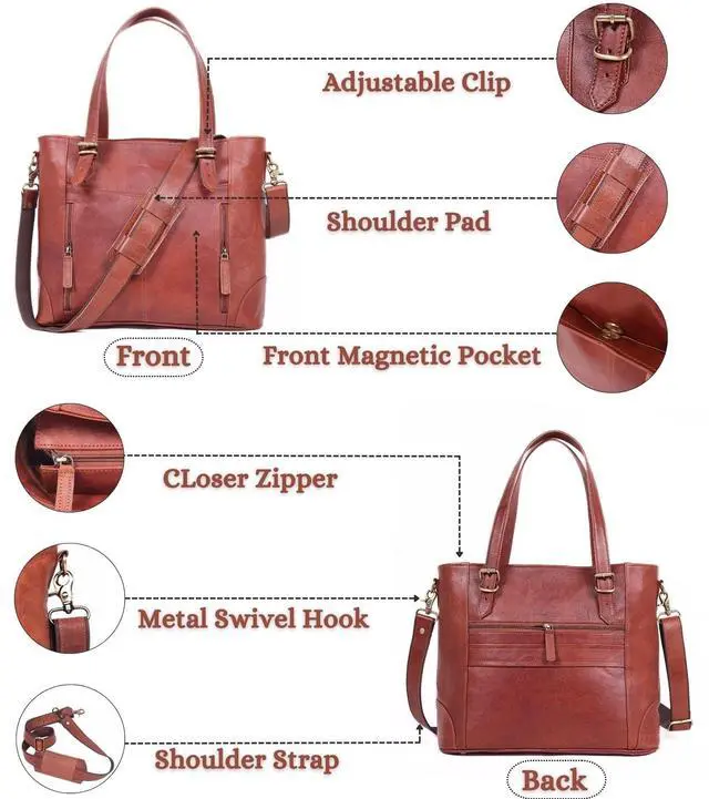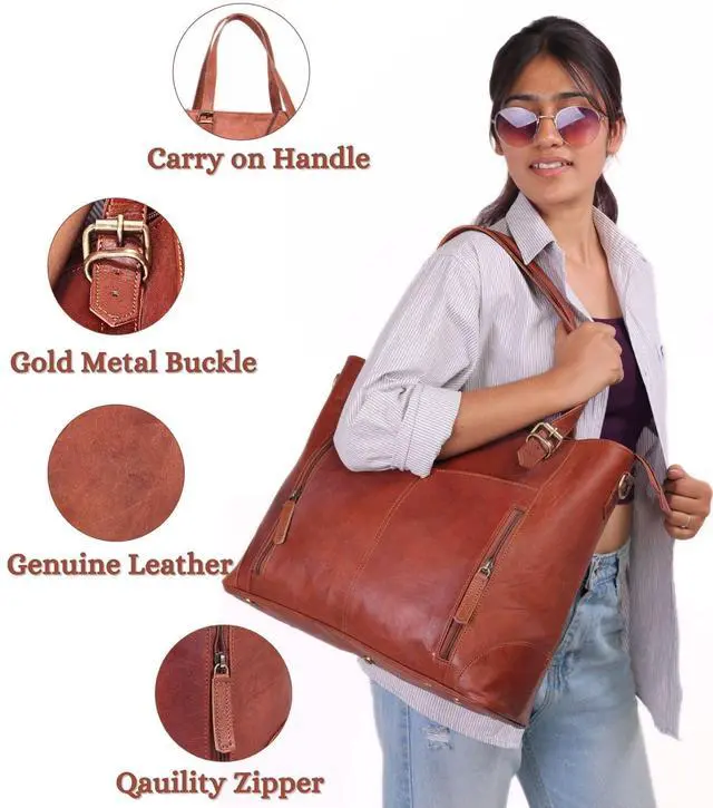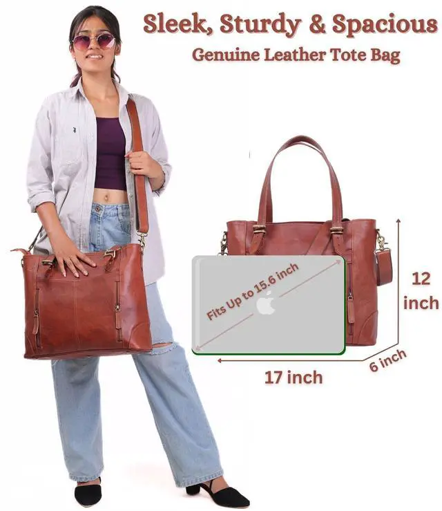 SPACIOUS & ORGANIZED: No More Searching Through A Cluttered Bag! Our Leather Briefcase for Women is Perfectly Sized At 17" (width) X 12" (height) X 6" (depth) Includes Multiple Compartments, A Padded Laptop Section, and A Zipper Pocket for Keys & Phones. Whether You Need Leather Work Bags for Women or A Leather Purse Tote, This Oversized Leather Computer Bags for Women's Sturdy Design Ensures That You Get A Premium Item That Will Endure For Many Years ^^ PREMIUM GENUINE LEATHER BUILT TO LAST: Crafted From Top-grain, Brown Leather, This Leather Tote Bags For Women Withstands Daily Wear While Maintaining Its Elegance. Our Brown Tote Bag for Women Features A Crossbody Shoulder Strap & Reinforced Leather Top Handles, Providing Durability and Style for Many Years To Come. Whether Youre Commuting, Traveling, Or Attending Meetings, This Genuine Leather Laptop Bag for Women Offers Durability Without Sacrificing Style ^^