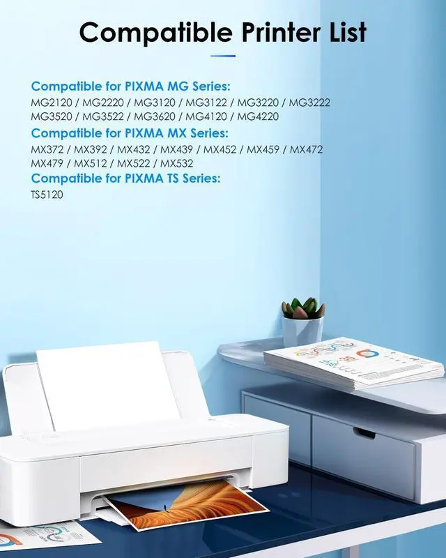 Printer Compatibility: Compatible for Canon Pixma MG3620 MG3600 MG2120 MG2220 MG3120 MG3122 MG3220 MG3222 MG3520 MG3522 MG4120 MG4220 MX372 MX392 MX432 MX439 MX452 MX459 MX472 MX479 TS5100 TS5120 Printer ^^