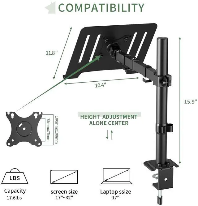 WIDELY COMPATIBILITY - The laptop mount fits Laptop/Notebook up to 17", monitors up to 32" with VESA mounting holes 75x75mm and 100x100mm and supports weight up to 17.6 lbs. The ventilated tray 11.8" x 10.4" is detachable and support you to switch between laptop and screens at will. ^^ HEALTHY WORKSTATION - Laptop desk mount allows you to lift the laptop/notebook up from your desk surface to an ergonomic height. A better viewing angle encouraging correct posture for your neck and back, which is helpful to create a healthy office and improve your work efficiency.
