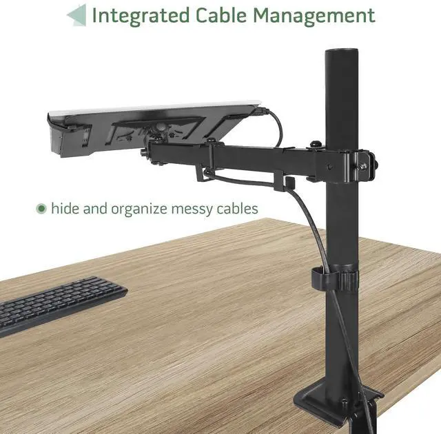 ^^ FULL MOTION ARM - Adjustable laptop arm mount offers 90 tilt, 180 swivel, 360 rotation, the height adjustment along the center pole. Arms have three joints that allows you to adjust the position of the notebook anywhere. ^^ CABLE MANAGEMENT SYSTEM - Keep your power and AV cables clean and organized with detachable cable clips on the arms and center pole. Cable clips keep cables organized and protected. Just enjoy your working, gaming, or viewing hours in a more comfortable environment. ^^ EASY INSTALLATION - The laptop mount for desk is easy to install with C-clamp or grommet mounting.