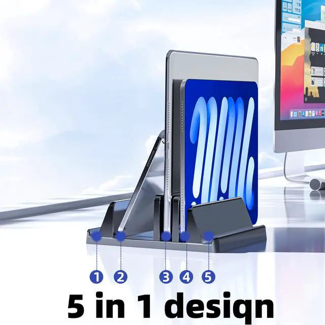 Design: This innovative vertical laptop stand adopts a 3-in-1 design, integrating a laptop, tablet and smartphone into one unit to meet your different needs in various scenarios. Whether it is work, study, video conferencing or leisure entertainment, you can easily switch between them, greatly improving the utilization of desktop space.