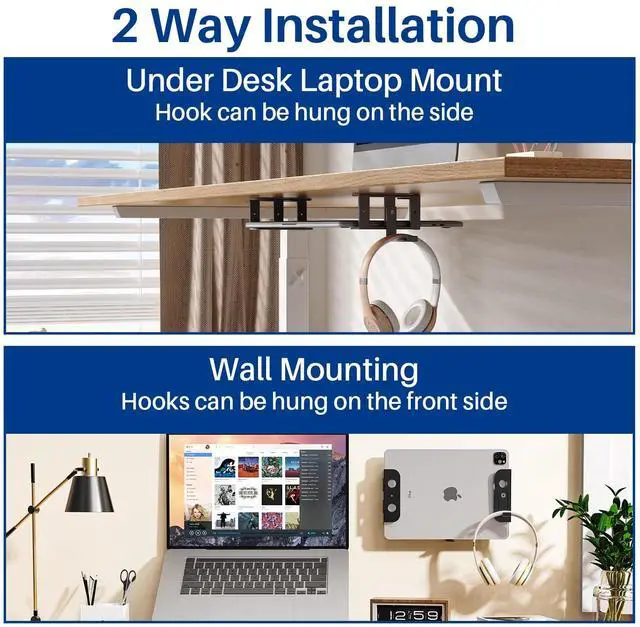 Space Saving: Our laptop stand sits under the table, saving valuable desktop space and bringing you great convenience. It not only supports laptops, but also suitable for devices up to 2.1 inches thick. for Macbook, laptops, Mac Mini, cable boxes, modems, smart TV boxes and more. It can effectively save space, keep leg room and prevent your legs from being impacted! It also keeps your desktop environment cleaner and more organized ^^ High