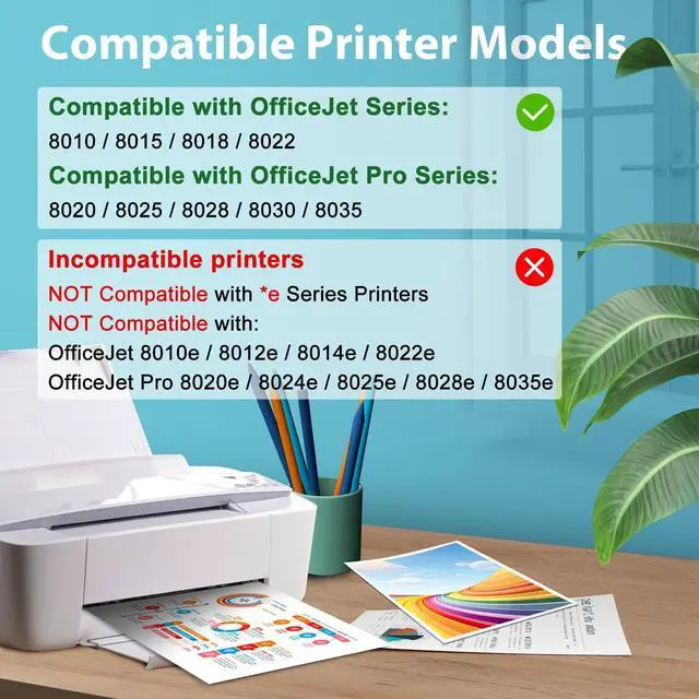 Note: Our 910XL ink cartridges for HP printers incompatible with printers with *e series printers for HP+ service, such as OfficeJet Pro 8020e, 8024e, 8025e, 8028e, 8034e, 8035e, OfficeJet 8010e, 8012e, 8014e, 8015e, 8022e. Please confirm compatible printers model before purchasing our 910 XL ink cartridges 910 ink cartridges ^^ Latest Version Chip for 910