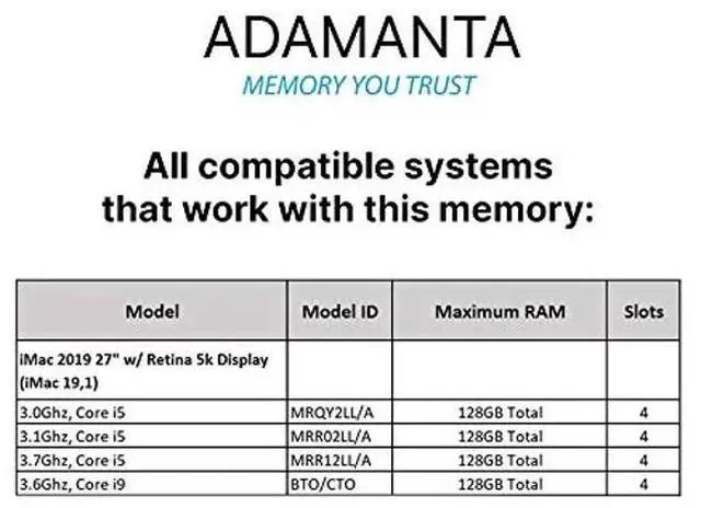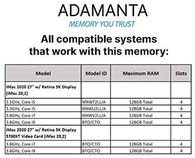 128GB ( 4x32GB ) DDR4 2666 MHz Non-Parity/Non-ECC Unbuffered SODIMM Memory 260 pin Dual Rank Module. Limited lifetime warranty by Adamanta. We will replace defective memory with the same or similar memory specifications. Physical or cosmetic damages are not covered by the limited lifetime warranty by Adamanta. Only limited to Adamanta branded Memory Excludes major OEMS such as Samsung, Hynix, Micron, etc. ^^ Memory Upgrade Compatible with 2020 27 inch iMac w/ Retina 5K