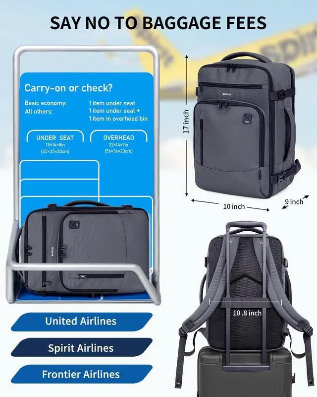 SAY NO TO BAGGAGE FEES: The ECOHUB 25L Carry On Bag is perfectly sized to meet United Airlines' personal item requirements. Measuring 17" x 10" x 9" and weighing just 1.6 lbs, it fits neatly under the seat. Its also compatible with Spirit, Frontier, EasyJet and many other airlines. (Patent Pending) ^^