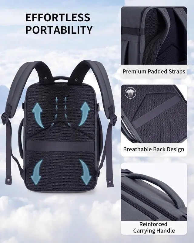 DESIGNED FOR TRAVEL: This carry on backpack features a 180 opening for easy packing. The main compartment includes two pockets to keep toiletries and socks organized, with elastic straps to secure your essentials. A dedicated AirTag pocket helps you track your bag easily. Side compression straps compact the bag, while the side handle and trolley sleeve provide multiple carrying options for added convenience.