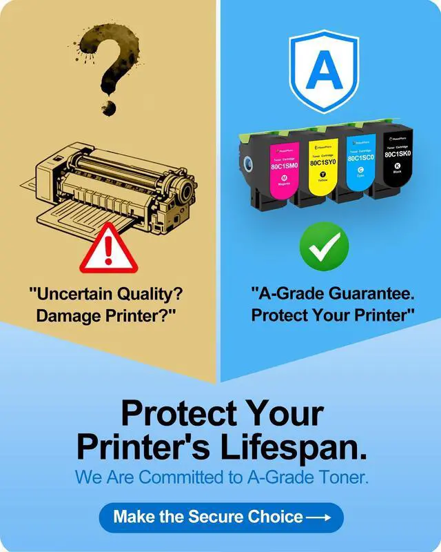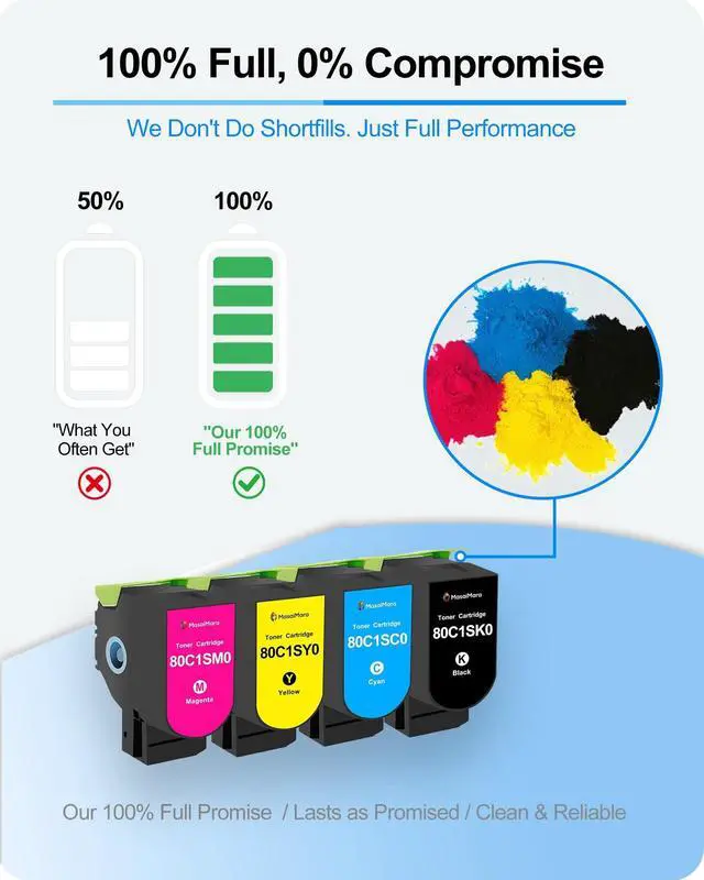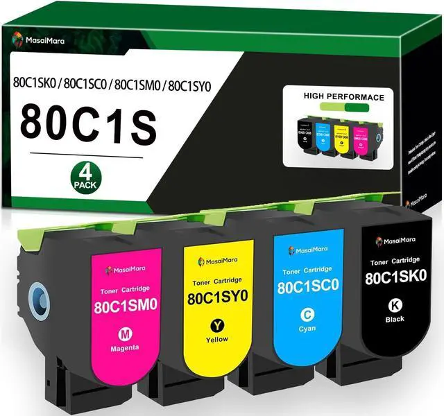 Exact model replacement: Specifically designed to replace Lexmark 80C1SK0, 80C1SC0, 80C1SM0, and 80C1SY0 toner cartridges for seamless integration and performance. Formulated with premium A-Grade toner, these cartridges deliver sharp, professional prints with vibrant color accuracy while ensuring reliable performance that protect your printer and extends its lifespan.