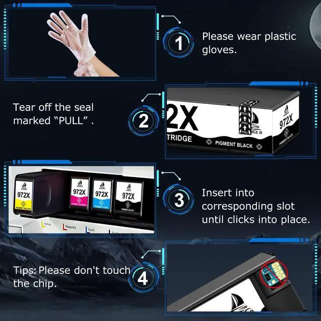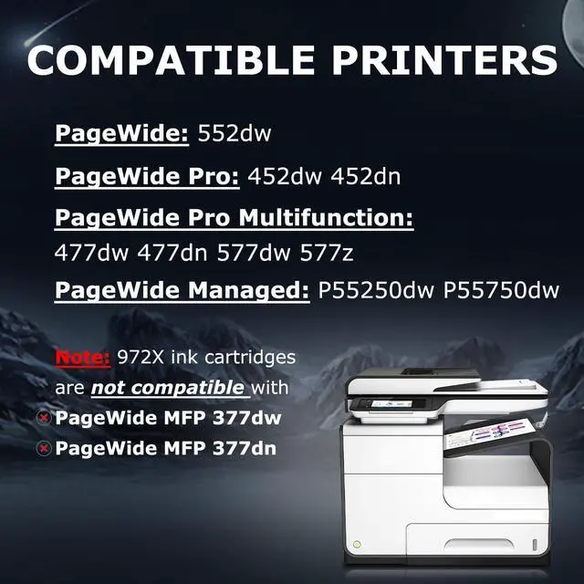 Chip Upgrade Device Upgrade to the latest version at any time with the upgrade device, no headachesc about the printer not recognizing the ink cartridge ^^ Compatible PrintersPageWide Pro 452dn 452dw PageWide Pro 477dn 477dw 552dw 552dn 577dw 577z P55250dw P57750dw Printer ^^ Packag Contents 1 x Black 972X, 1 x Cyan 972X, 1 x Magenta 972X, 1 x Yellow 972X, 1 x Chip Upgrade Device, 1 x Gloves, 1 x User Guide ^^ Extra High Yield10, 000 pages per Black 972X ink cartridges, 7, 000 Pages per Cyan 972X, Magenta 972X, Yellow 972X (at 5% coverage) ^^ Advantages Multiple Certifications, Premium Print Quality, Cost Effective, Newest Chip, Secure PackedShow Ink Level ^^ Reliable SupportDOUBLE D offer 24 hours support, please don't hesitate to get in touch with us if you have any questions
