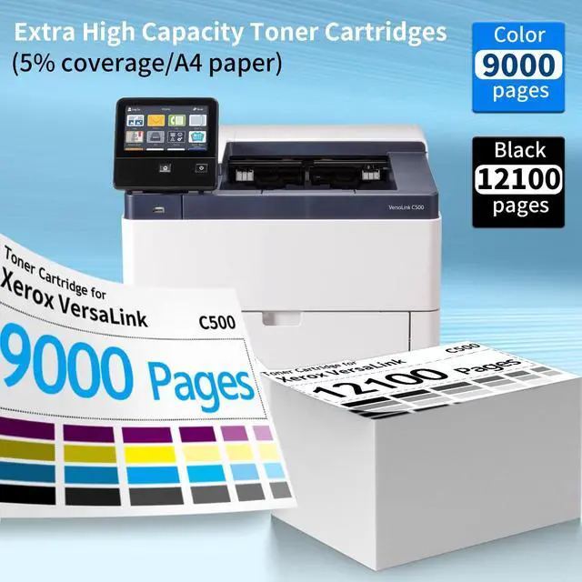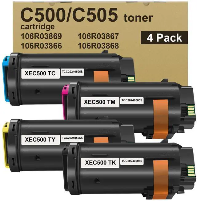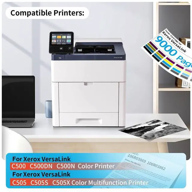 Compatible withReplacement for versaLink C500 C500N C500DN color printer & versaLink C505 C505X C505S color multifunction printer toner cartridge. ^^ Cartridge CodeVersalink c505 black toner code 106R03869 106R03862, cyan code 106R03866 106R03863 106R03859, magenta code 106R03867 106R03864 106R03860, yellow code 106R03868 106R03865 106R03861. ^^ Extra High CapacityVersalink c500 black toner cartridge can print 12, 100 pages, Each color toner cartridge can print 9, 000pages (cyan magenta yellow ) letter/A4, at 5% coverage, high yield printing makes your work easier. ^^ Excellent Quality The c505 toner particles of this toner cartridge are tiny and fine, with stable quality, strong adsorption force and not easy to fade.