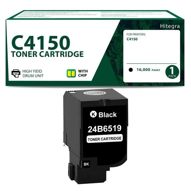 Remanufactured C4150 Toner Cartridge - C4150 toner cartridge with 1 pack (Black/24B6519), upgraded materials and chip bring the perfect printing experience ^^ High Capacity Yield Pages - C4150 toner cartridge up to 16, 000 pages for black, based on 5% coverage of A4/Letter ^^ Compatible with Printers - 24B6519 C4150 toner cartridge replacement for Lexmark C4150 printers ^^ 24B6519 Black Toner for Hitegra - C4150 toner can automatically recognize the printer, and press determine key according to the reminder after connecting the printer. Compatible cartridge can provide printing for clear and natural print result ^^ Be Widely Used - Hitegra C4150 black toner cartridge is widely used in a variety of occasions, including banks, hospitals, schools, companies, shops and so on, whether it is home printing or office printing can be used ^^ Satisfactory Experience - 24B6519 toner cartridge offers reliable compatibility and produce clear text and vivid image effect.