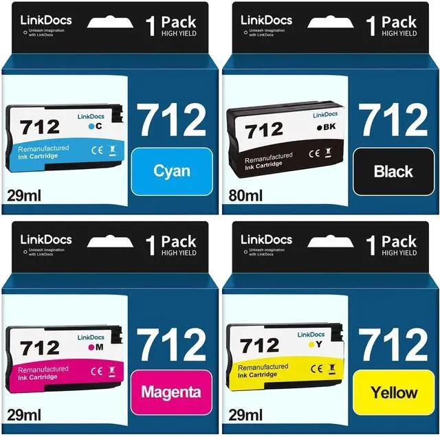 LinkDocs 712 Remanufactured Ink Cartridge (4 Pack, 80-ML Black, 29-ML Cyan/Magenta/Yellow) Replacement for HP 712 Ink Cartridge to use with DesignJet T650, T630, T230, T210 Studio Plotter Printer