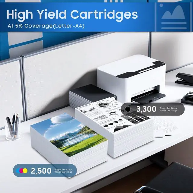 High Page Yield: 124A Black Toner Cartridge can print 3, 300 pages, and each 124A color Toner Cartridge can print 2, 500 pages (5% coverage/A4 paper) Minimize the hassle of frequently changing toner cartridges ^^