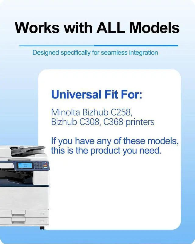 ^^ Compatible Models: Specifically engineered for seamless integration with Konica Minolta Bizhub C258, Bizhub C308, and Bizhub C368 printers.
