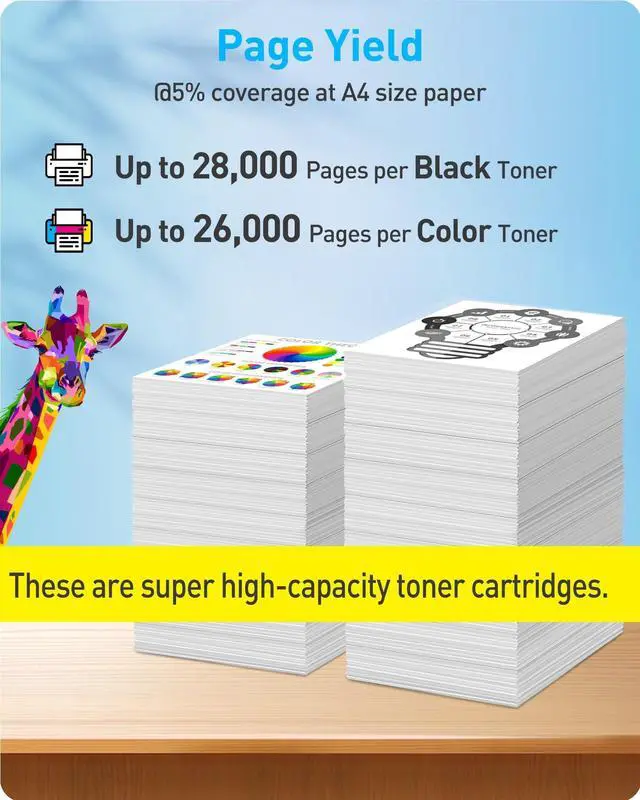 ^^ Page Yield: Delivers an impressive output of up to 28, 000 pages from the black toner and 26, 000 pages from each color toner, based on 5% page coverage on A4 paper.