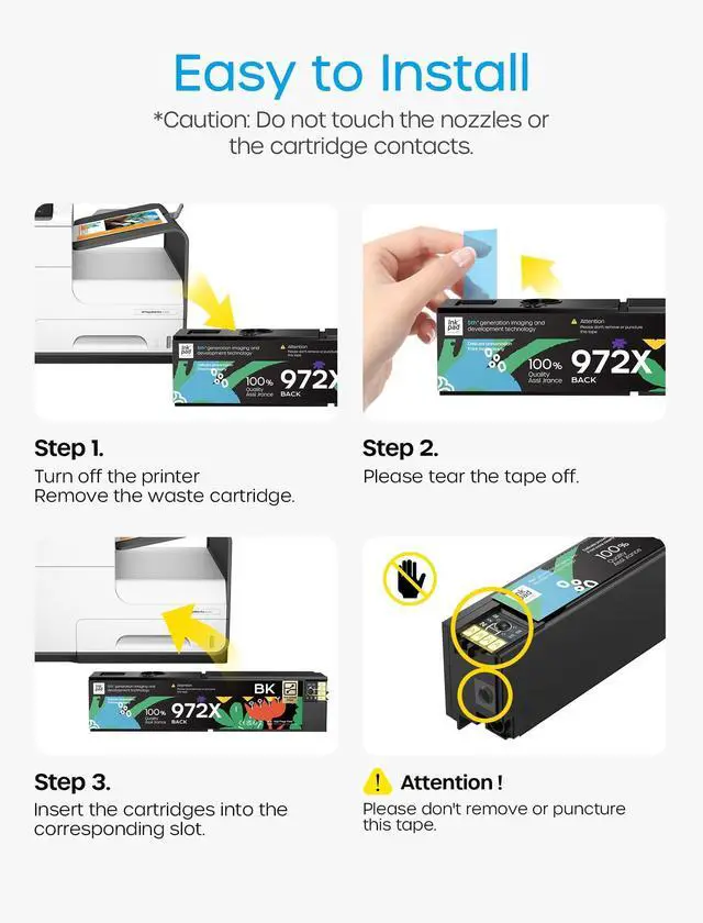 ^^ Exceptional Print Quality Our non-OEM 972x ink cartridges come filled with premium quality ink that delivers vibrant, sharp, and professional-looking prints, ideal for both text documents and graphics. They are engineered ensuring a seamless printing experience without compromising on print quality or performance. ^^ Reliable Warranty Timely after-sales and quality assurance services, let you to enjoy the fun of printing easily. If there is any problem with the purchased product or you bought the wrong one, please contact us and we will help you solve it, 24/7 technical support and customer service.