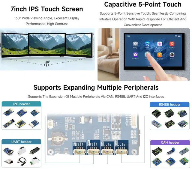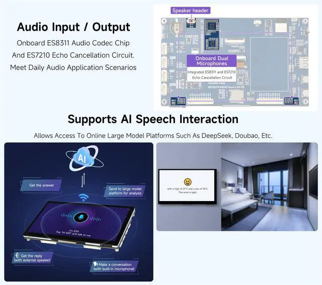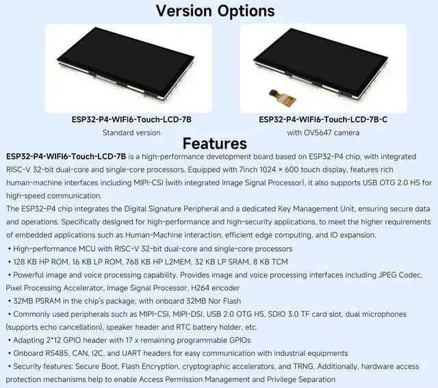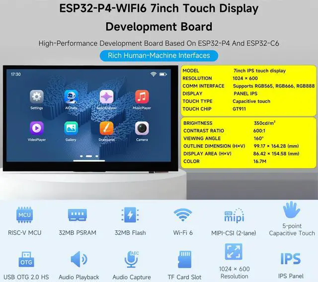 Based on ESP32-P4 and ESP32-C6 High-Performance Development Board, onboard ESP32-C6-MINI module extends 2.4GH z Wi-Fi 6 and Bluetooth 5 (LE) for ESP32-P4, using SDIO interface protocol for stable connection and efficient transmission. Adopts ESP32-P4-Core module, with built-in ESP32-P4 and 32MB Nor Flash. ^^ Onboard 7inch IPS touch screen, 160 wide viewing angle, Excellent display performance, high contrast. Supports 5-point sensitive touch, seamlessly combining intuitive operation with rapid response for efficient and convenient development. ^^ Onboard ES8311 audio codec chip and ES7210 echo cancellation circuit. Meet daily audio application scenarios.