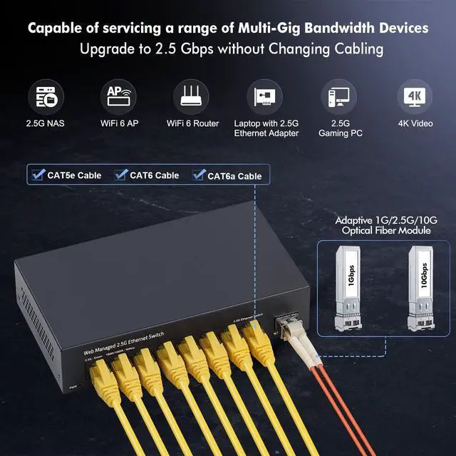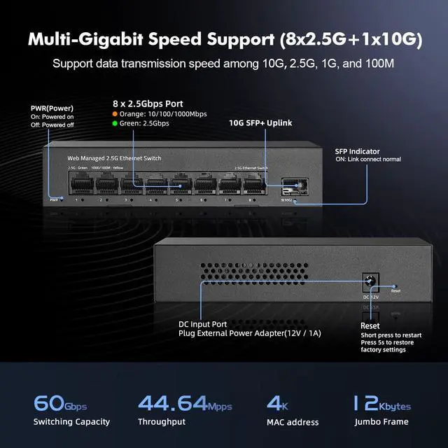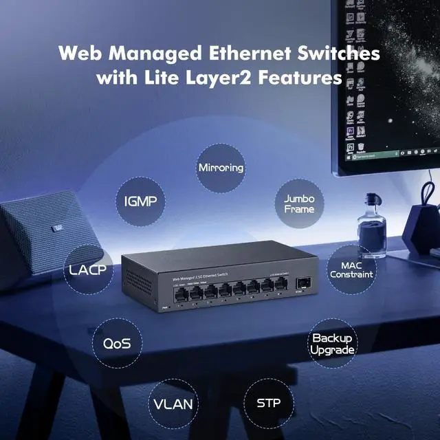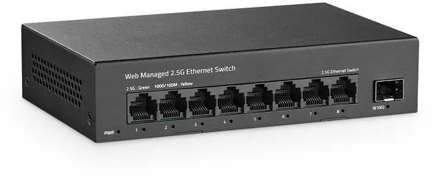 8-Port 2.5G be Switch8-port 2.5G managed network switch with 8 x 2.5G RJ45 Ethernet ports and 1 x 10G uplink SFP+ ports. It supports 10/100/1000M/ 2.5G adaptive and 60Gbps backplane bandwidth to meet th broadband needs of more devices. ^^ Smart Web ManagedThe 2.5 Gigabit managed switch supports device/port status query and various L2 configurations, such as VLAN, QoS, security, multicast, static aggregation, LACP (version 1.9 and above), MAC address table, diagnostics, and so on. The functions are more powerful than unmanaged switches.