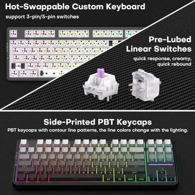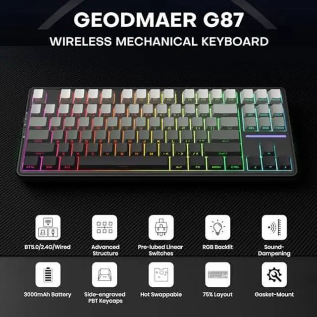 GEODMAER G87 Wireless Mechanical Keyboard, Tri Mode 2.4GHz/USB-C/BT5.0 Hot Swappable Custom Gaming Keyboard, Pre-lubed Linear Switches, RGB Backlit, Side Printed PBT Keycaps Keyboard for PC Mac Gamer