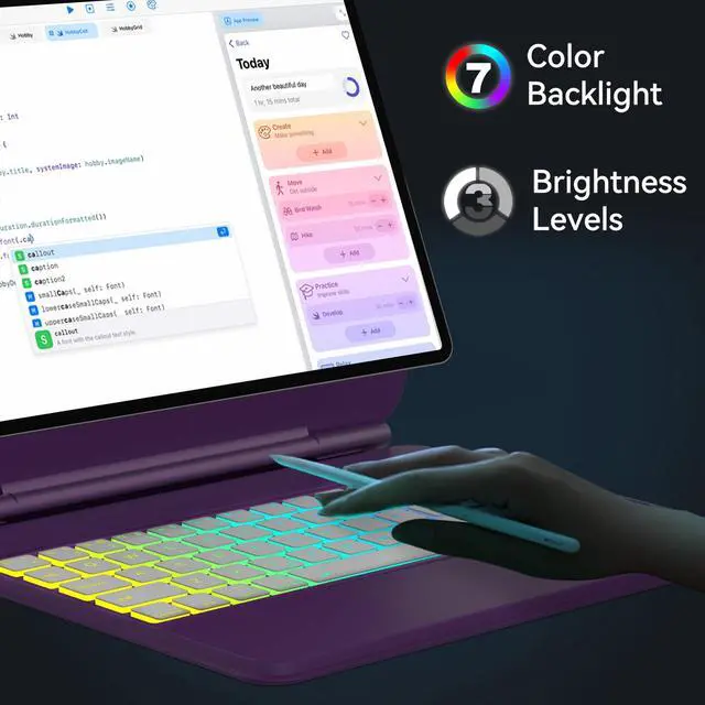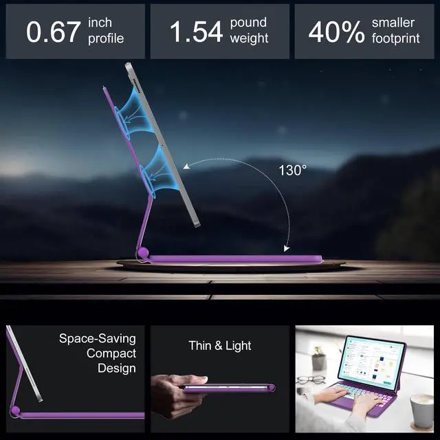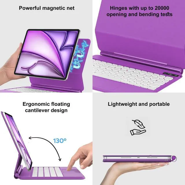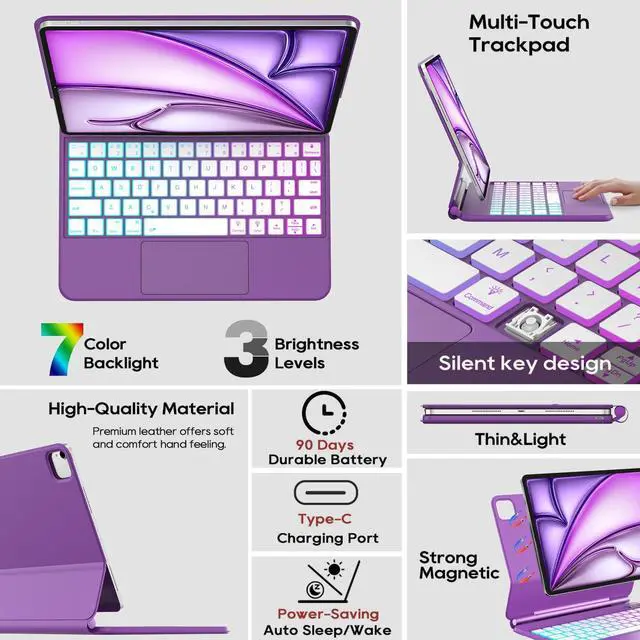 Note: Please check the model number starting with "A" on the back of your iPad before purchasing. ^^ Easy-Set Floating Magnetic StandThe durable aluminum alloy hinge holds the floating cantilever stand firmly in place. Lots of small magnets are built into the PU leather back cover, allowing you to attach your Tablet magnetically and transform it into a laptop in a second. The magnetic stand can be adjusted smoothly to achieve a perfect viewing angle for typing, reading, and watching. ^^ Precision Multi-Touch TrackpadThe case with keyboard for ipad air 5th generation has a built-in precision trackpad that can quickly and easily navigate your iPad. Full multi-touch gesture support lets you redefine productivity by allowing you to edit documents, build presentations, and browse the web with unparalleled speed. ^^ Rainbow Color Backlight Keyboard with ShortcutsFluidly and accurately typing on the lighted keyboard for ipad air 5th gen even in a dark room, ergonomic keys, rainbow colors of backlight, and three adjustable backlight brightness levels give you a comfortable typing experience. No more searching around for basic functions, be more efficient with a full row of practical shortcuts to adjust brightness levels, change backlit colors, media, volume control, and more.