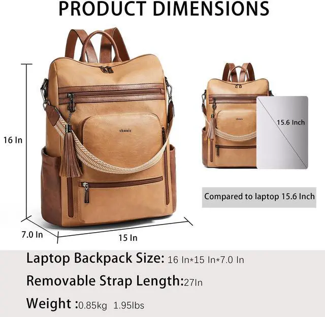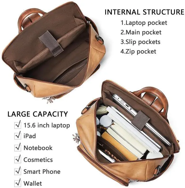 Leather Laptop Backpack for WomenMade of high quality waterproof Vegan leather, HEAVY DUTY & DURABLE. Total of 9 pockets, easy to organize all work necessities, college supplies, travel essentials. ^^ Practical Backpack Luggage Strap DesignDesigned for traveling, it helps you free your hands and back from the burden. Make your travel more convenient and enjoyable. Waterproof travel backpack fits under the seat also meets airline carry-on requirements. ^^ Large CapacityThe large capacity laptop backpack has multiple divider pockets, easy for holding laptop, ipads, Phone, binder, water bottle, umbrella, magazine, pens, wallet and so on.