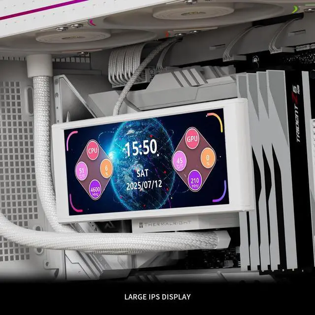 [Heat Sink Parameters] The size of the CPU heat sink is 403x120x52mm, the cooling head is 187.2 x 95.8 x102mm, the water pump speed is 6400RPM10%, the voltage is DC 12V, and with the cooperation of three high speed fans at 2150RPM, it can ensure that the cooler cools the CPU temperature well ^^ [ 6.86 inch long screen] magnetic cold head full-color LCD display is easy to disassemble, 1280x480 resolution has good viewing angle stability, not only can accurately restore the color, make the picture more real and delicate, support magnetic chassis fixed screen panel ^^ [Row 3 Fans] pre-installed one-piece fan double-sided four ARGB arc light strips, improve the appearance of the fan, the fan's secondary dispensing dynamic balance (red mud) correction and good S-FDB V2 bearing, not only reduce friction and vibration, but also reduce the sound and prolong the life during operation ^^ [Detail Optimization] adopts an upgraded version of the SS2 full set of fasteners, which can be switched between CPU cooler and CPU liquid cooler.