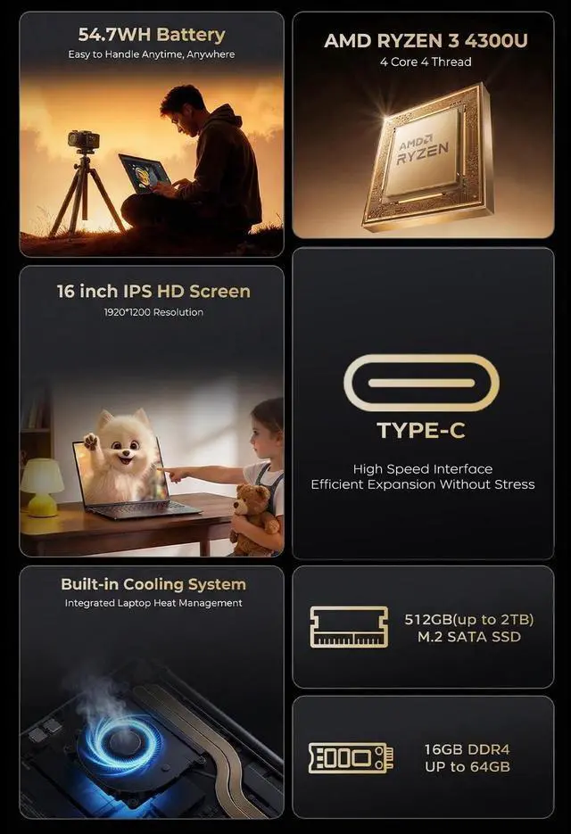EFFICIENT PERFORMANCEKAIGERR Laptop featuring the latest AMD Ryzen 4300U Processor (4 cores/4 threads, up to 3.7GH z). Outperforming the AMD Ryzen 3500U/Celeron N5095/N100/N97/N95, it delivers robust multitasking capabilities. The laptop computer has an integrated UHD graphics card clocked at up to 1200MHz for stronger graphics processing performance. KAIGERR laptop is designed to elevate your computing experience. ^^ Powerful ConfigurationFeaturing 16GB of DDR4 RAM and a speedy 512GB M. 2 SSD, this notebook offers a 50% performance boost compared to DDR3-equipped machines and ensures seamless system operation while accommodating your personal files.