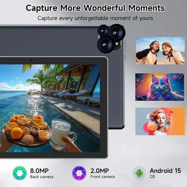 2.4G /5G WiFi 6+6000mAh Our android 15 tablet lets you enjoy lightning-fast Internet speeds with 5G WiFi connectivity. It makes it easy to stay connected on the go, providing a more convenient experience for entertainment, browsing, gaming and shopping. It also comes with an 6000mAh battery that lasts up to 10 hours on a single charge, perfect for long-distance commuting and travel.