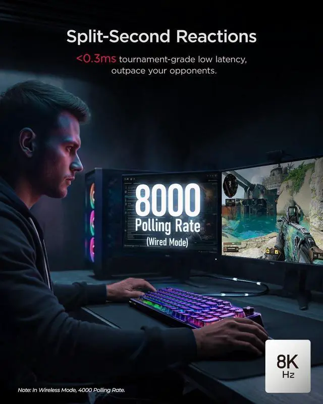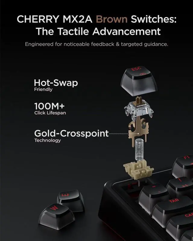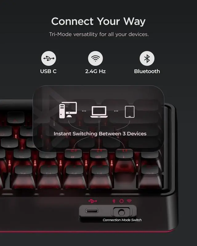 CHERRY MX2A SwitchesCrafted in Germany, these switches feature Gold Crosspoint Contact technology for smoother actuation, improved acoustics, and a 100-million-keystroke lifespan. Their hot-swappable design allows for easy, solder-free customization ^^ Split-Second Reaction Enjoy tournament-level performance with 4000 Hz wireless and 8000 Hz wired polling rates for under 0.3 ms latency. Full N-key rollover supports you in complex scenarios, ensuring your commands are captured with precision ^^ Tri-Mode Connectivity This PC keyboard provides a versatile three-in-one connection solution. Enjoy a reliable USB-C wired connection, low-latency 2.4 GHz wireless, or Bluetooth mode to effortlessly switch between three different devices ^^ Gasket-Mounted Enjoy a smoother and more pleasant typing feel from the gasket design and multi-layer internal padding.