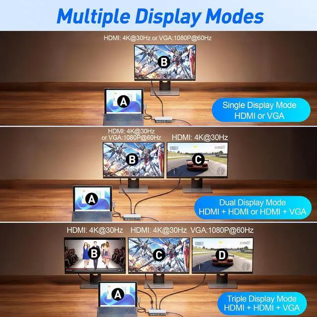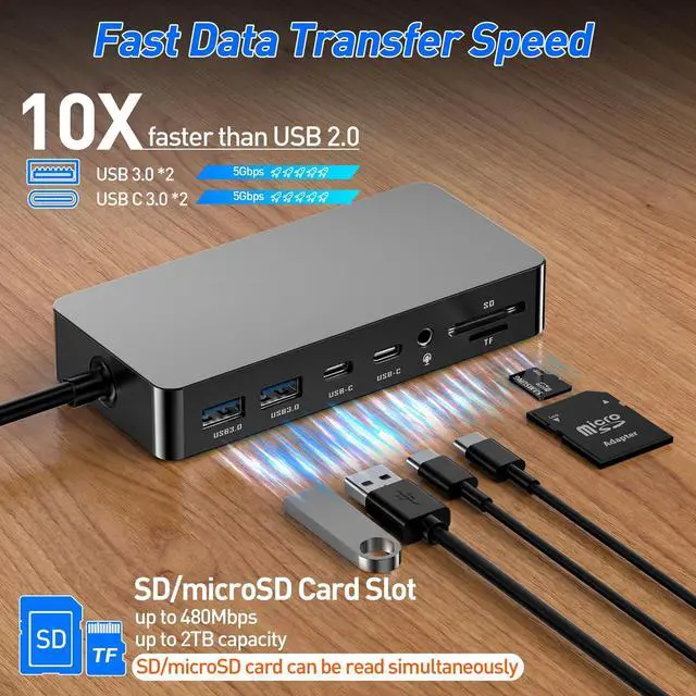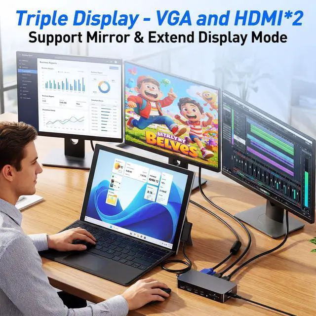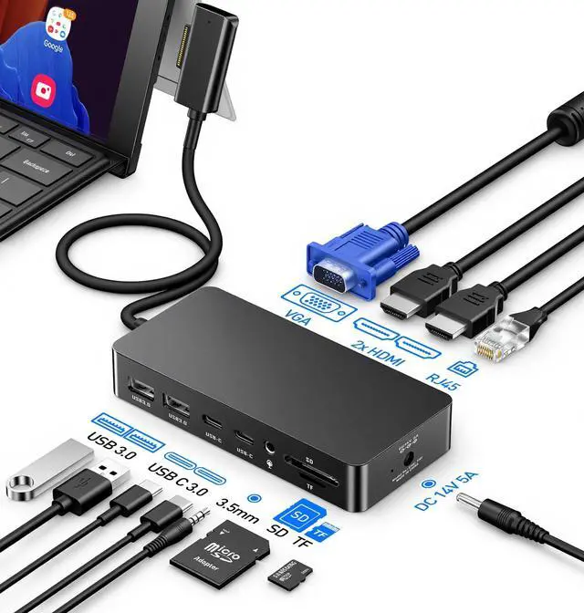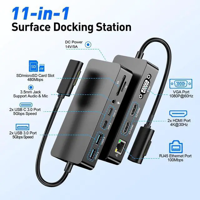 11-in-1 Surface Docking Station for Ultimate Productivity Elevate your Microsft Surface experience with our 11-in-1 surface docking station. Designed around the genuine Magnetic Connector, it transforms your Surface into a powerful workstation. Expand connectivity with Dual 4K HDMI ports (4K@30Hz), a 1080p@60Hz VGA port, 2x USB-C (5Gbps), 2x USB 3.0 (5Gbps) ports, a 100Mbps RJ45 Ethernet port, SD/TF card readers (up to 2TB), and a 3.5 mm audio jack. Perfect for Surface Pro, Surface Book, Surface Laptop, Surface Go and more ^^ Ultra HD 4K Output & Support Triple DisplaysThis microsft surface docking station supports triple displays - HDMI + HDMI + VAG, and supports extend or mirror mode, boost your efficiency 3 times.