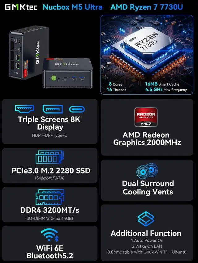 Office & Gaming Mini PC: GMKtec Nucbox M5 Ultra equipped with the AMD Ryzen 7 7730U, 8 Cores/ 16 Threads. With Turbo Boost up to 4.50GH z. Based on the ZEN 3+ architecture, this small but robust mini PC excels in productivity tasks, daily office work, and smooth 1080p gaming, 35%+ higher performance compared to previous AMD Ryzen 5 7430U / Ryzen 7 5700U/5600U/5560U models. ^^ 16GB DDR4 RAM & 1TB