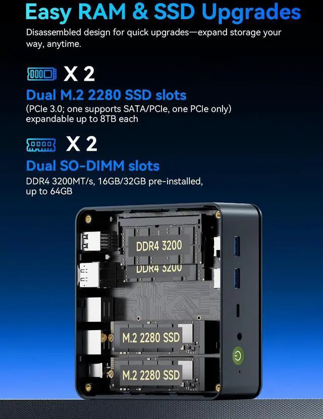 SSD: Pre-installed with 16GB DDR4 RAM in Dual-Channel (28GB), the supporting expansion up to 64GB. Equipped with a 1TB M. 2 2280 PCIe 3.0 SSD that offers fast storage access and supports dual-slot expansion for up to 16TB (8*2) total SSD (Upgrades not included). ^^ Dual 2.5G LAN for