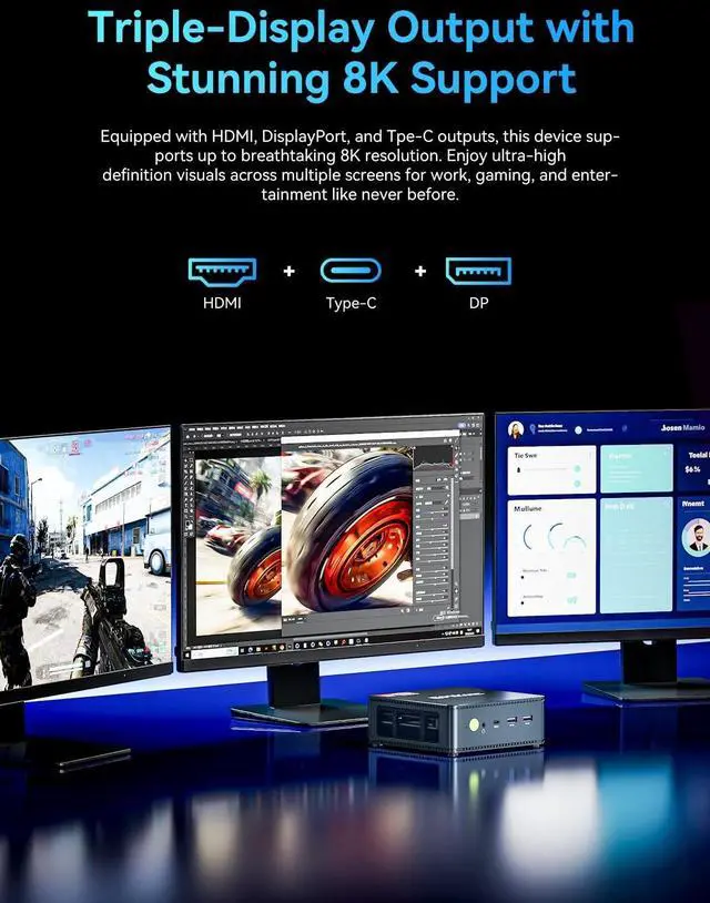 ^^ 4K Triple Display: The mini desktop computer integrated AMD Radeon Graphics with 8 cores 2000 MHz provides strong graphical performance for design software, 4K@60Hz UHD video editing. Connect up to triple monitors (via HDMI 2.0 and DP and type C ports )simultaneously for an multi-screen workspace-perfect for stock traders, remote workers, and content creators. ^^ Wi-Fi 6E & BT 5.2 for