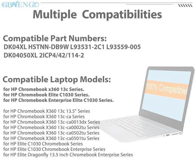 Battery Condition: 100% brand New from Manufacturer. ^^ Compatible Model for HP Chromebook x360 13c Series. for HP Chromebook Elite C1030 Series. for HP Chromebook Enterprise Elite C1030 Series. ^^ Compatible Part No#DK04XL HSTNN-DB9W L93531-2C1 L93559-005 DK04050XL 2ICP4/42/114-2 ^^ Quality First We have passed a series tests of short circuit, overheating, and overload protection before shipments. The newest generation chips, grade A cell battery, provide long cycle life, stable performance and broad compatibility. ^^ Service First-rate We promise 30-Day Refund & 1-Year Warranty. For any battery questions, just feel free to contact us for help via the order or click on"GBNENGTD", then you can see "Ask a question" on the page. We are here to serve for you for any battery problems within 24 hours.
