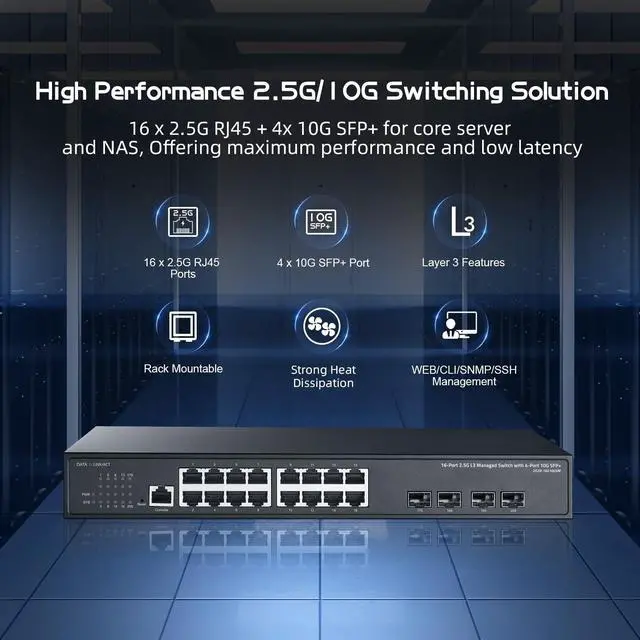 2.5G Ports16x 2.5G igabit ethernet Ports, support 100M/1000M/ 2.5G bps rate adaptive function, support Auto-MDI/MDIX function. 2.5GBASE -TX UTP category 6, 6Acable (100m) ^^ 10Gbps SFP+ Slots4x10G optical port support standard module 10G/ 2.5G /1G adaptive, open standard SFP slot, support SR/LR/LRM/ER/ZR and other models (default without module) ^^ L3/L2 Web/Cli ManagedSupport L3 Management, IPv4/IPv6, Static Route, OSPF, RIP, BGP4, DHCP Server, QoS, ACL, SNMP, STP/RSTP/MSTP (ERPS), Bandwidth Control, Flow Control, Spanning Tree, link aggregation, loop detection; Support VLAN config, IP-MAC-VLAN Port Binding, device/port status query.