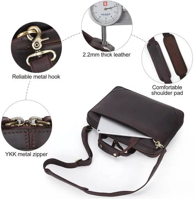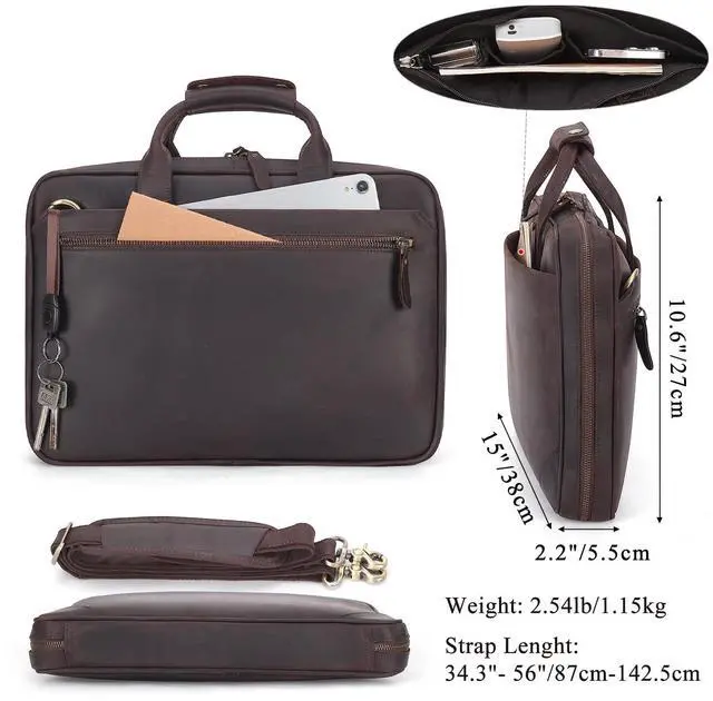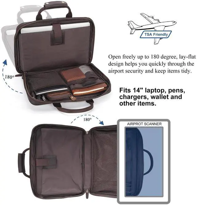 length: 34.3 -56. Wide 2.4 strap pad released load burden, breathable and friendly to shoulders. ^^ TSA Friendly Briefcase with Removable Strap Its 180opening lay-flat compartment is checkpoint friendly to pass scanner quickly at airport and easy access for you to reach items quickly. With padded adjustable and detachable strap, the briefcases for men can be carried as cross body bags or shoulder messenger bags, to fit different occasions and needs. ^^ Sturdy Leather BriefcaseThis brown laptop briefcase is made of full grain leather, known as the top layer of natural leather. It is outfitted with ykk metal zippers with dual sliders, which are convenient to open and close the bag, sturdy to withstand 1000 times pull strength test. Customized heavy duty hardware, tear-resistant liner, and exquisite stitches by skilled artisans ensure the longevity of the men's leather computer bag. ^^ 14" Laptop Organizer Briefcase1x front zip pocket with 3 inner pouches; 1x middle main compartment with cushion for 14 inch laptop, 2 mesh pouches for easy viewing items, 2 pockets, 3 pen slots; 1x back pocket with key hook; 1xback zipper pocket to anti theft when carry the bag against your body.