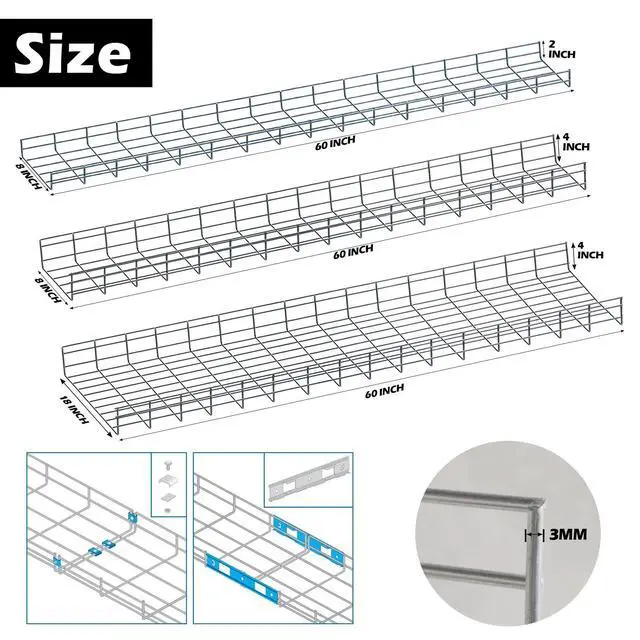 Standard Size & Multiple Variants The LAJIAOZ Wire Mesh Cable Tray comes in three sizes: 60" x 8" x 2", 60" x 8" x 4", and 60" x 18" x 4", offering versatile options for managing cables in both residential and commercial environments. Perfect for organizing network cables, fiber optic, AV systems, and more. Choose the size that best fits your needs for efficient cable routing and management. ^^ Premium Zinc-Plated Steel Construction Crafted from galvanized steel with a chrome finish, this wire mesh cable tray ensures durability and resistance to corrosion. Its strong and sturdy design makes it suitable for high-traffic areas, offering both long-term stability and a clean, professional look. Perfect for data centers, office setups, and other high-demand spaces. ^^ Flexible & Easy to Install The wire mesh tray design allows for easy cutting and customization, ensuring that your cable tray fits specific routing paths and installation needs. It can be installed floor-mounted, wall-mounted, or ceiling-hung, offering flexible installation options. Ensure best results by adding support every 5 feet. ^^ Professional-Grade Cable Management Designed for AV, IT, and fiber optic systems, this cable basket provides organized and secure routing for all types of cables.