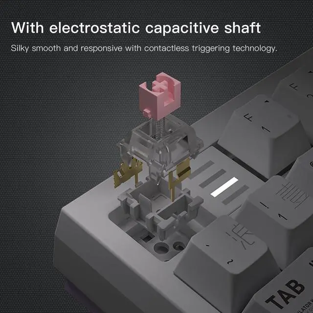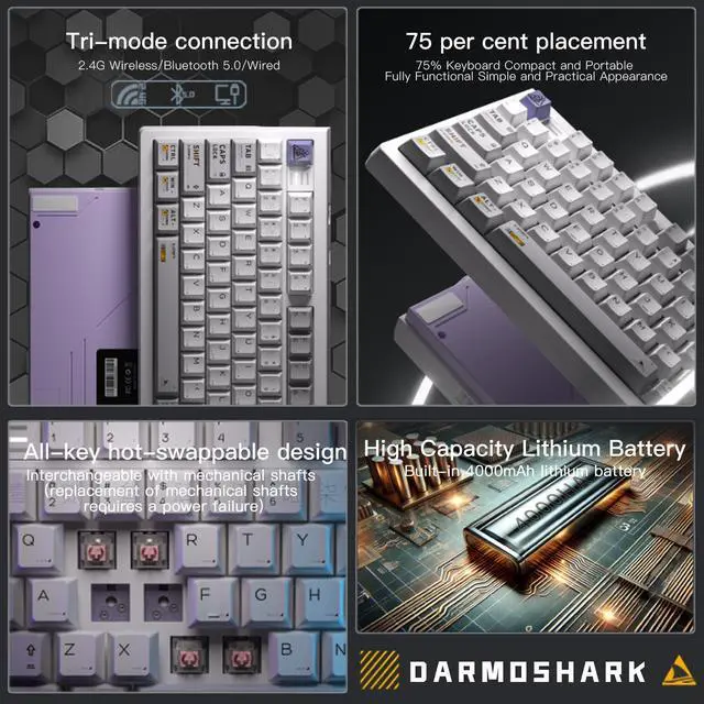 Compact 75% LayoutA compact, wireless mechanical keyboard with 75% RGB backlight (81 keys) with classically opaque, high profile and opaque PBT spherical keys. which have much higher strength and oil hardness than ABS keys, without Numpad, more practical for players and typists, frees up more space for your desktop. ^^ BT 5.0 / 2.4G /USB-CThis is the first generation of three-mode wireless keyboards on the market. Wireless mode with stable Bluetooth 5.0, trouble-free 2.4G hz dongle and USB-C wired mode set no limits on keyboard connection. ^^ Fully DIY- Hot SwappableAllowing you to enjoy the fun of building a highly customized mechanical keyboard that perfectly adapts to your typing habits and gaming anytime, anywhere.