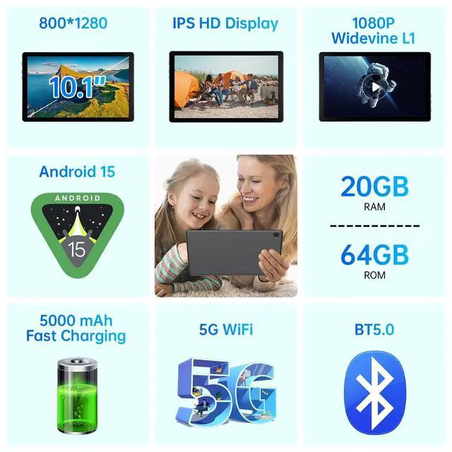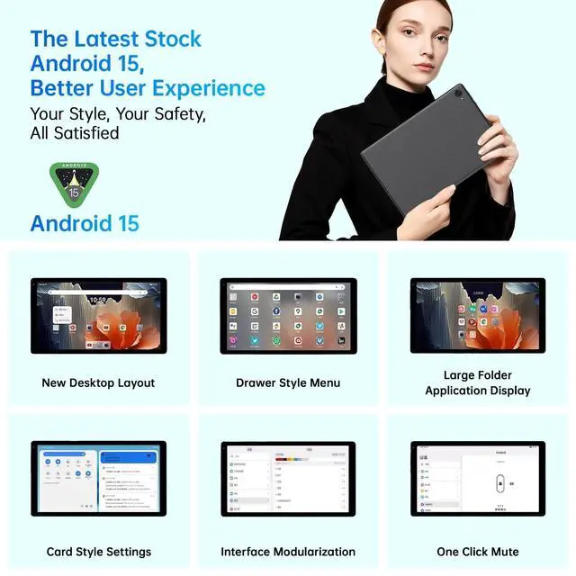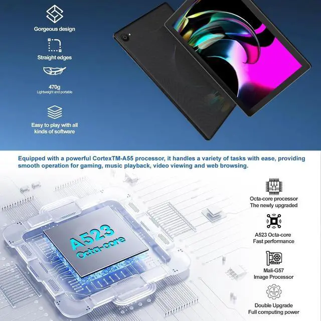 Newest Android 15 TabletMUISOO tablet comes with a powerful Android 15 system, which brings you a whole new task bar and a more user-friendly UI with enhanced customization options. Android 15 also emphasizes privacy and security by designing enhanced app permissions, giving users complete management control and offering heightened security measures. The update of PC mode also brings you more convenient operation and you can use Face ID to unlock tablet. ^^ Smoother Sensitive Experience & Fast ConnectionThe android tablet is equipped with a powerful A55 architecture and an Octa-core CPU, delivering a smooth and fast performance and convenient operations.
