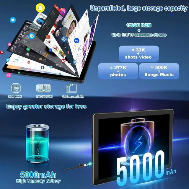 Whether you're watching videos, browsing the web, or listening to music, you'll enjoy a seamless and uninterrupted experience. ^^ 20(3+17)GB RAM + 128GB ROM+ 1TB Expandable This 10-inch tablet comes with 20 (3+17) GB RAM, 64GB ROM and a micro-SD card slot that allows for an expansion of 1TB of memory. Large and expandable storage can run more smoothly and you can quickly launch applications and enjoy it without the stress of running out of storage space. Feel free to download any app you want. ^^ Long-Life Battery & 10.1 HD ResolutionThe tablet android equipped with a high resolution 1280*800 IPS display, which shows a brightly colored wide-screen for a more realistic viewing experience with sharper and brighter images.