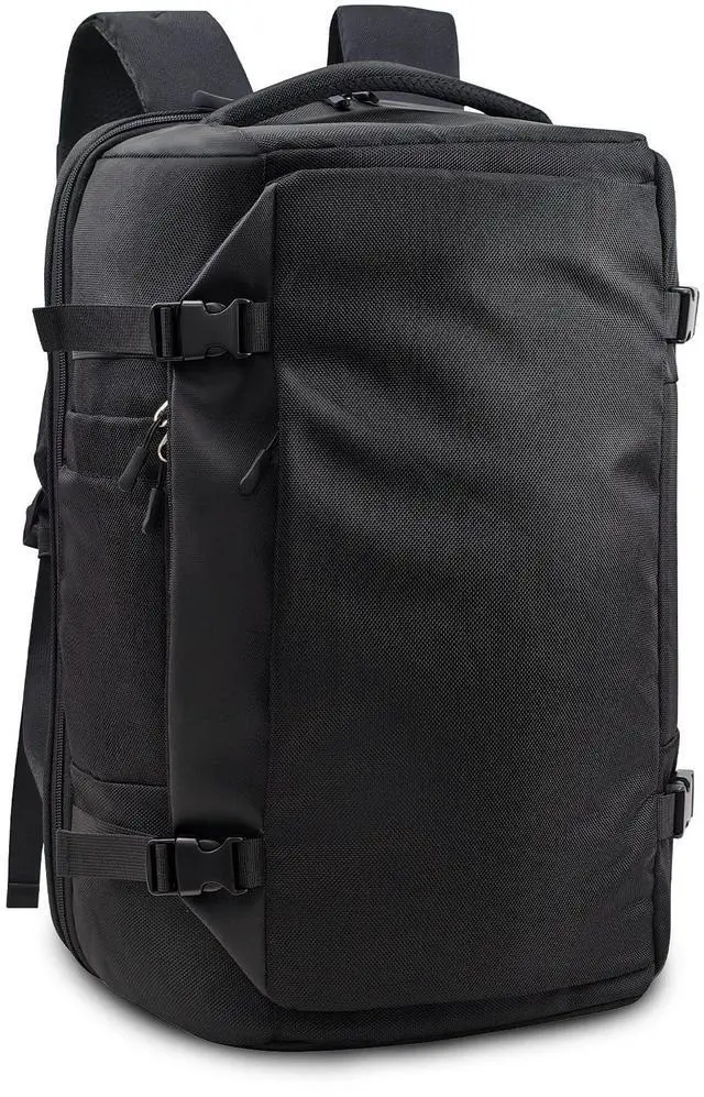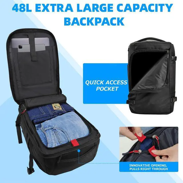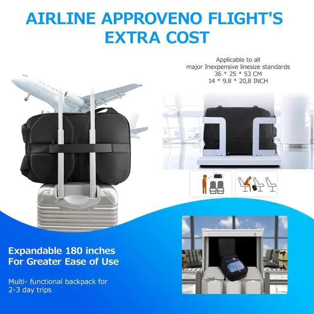 Spacious & Well-OrganizedDimensions: 19.7 x 13.4 x 8.3 inch (50 x 34 x 21 cm), the capacity ranges between 38-40L. This carry on backpack effortlessly fits all your travel essentialswhether for work, hiking, or weekend trips. The intelligently designed interior includes a dedicated 17.3" laptop compartment, a roomy main section for clothing or gear, and multiple pockets for accessories ^^ Quick-Access & Convenient DesignEasily retrieve your belongings from the front-access pocket, while the suitcase-style main compartment allows effortless packing. Additional compartments securely hold a tablet, glasses, and documents for on-the-go convenience. Perfect as a travel backpack for women or a backpack for men, it combines style and functionality ^^ Flight ApprovedThe laptop compartment is friendly designed to be opened 90-180 for security scanning, helping you get through airport checkpoints quickly. The black backpack meets IATA size requirements, making it an ideal travel backpack for men and women on flights ^^ Rugged & Secure ConstructionBuilt with high-density, heavy-duty Nylon 400DPU and a water-resistant coating, this travel backpack features an abrasion-resistant bottom for durability ^^ Ergonomic ComfortThe air vacuum design includes a multi-panel airflow system, 3D back pad, breathable straps, and a waist beltreducing pressure for comfort on long trips.