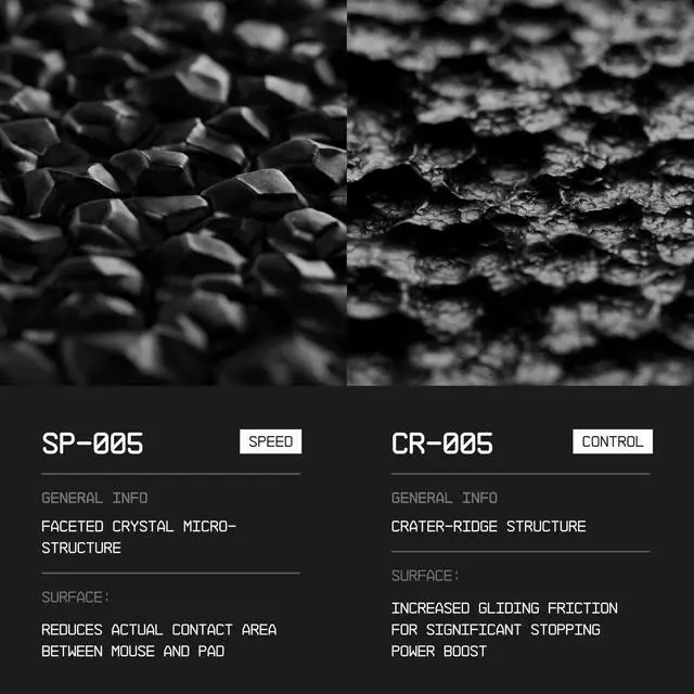 Speed Surface: A faceted crystal micro-pattern creates low surface resistance, giving your mouse a fast, fluid glide. Ideal for high-speed gameplay and fast aim corrections.